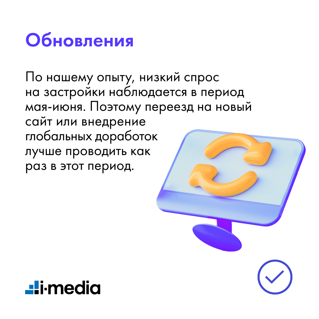 По нашему опыту, низкий спрос на застройки наблюдается в период мая-июня. Поэтому переезд на новый сайт или внедрение глобальных доработок лучше проводить как раз в этот период.