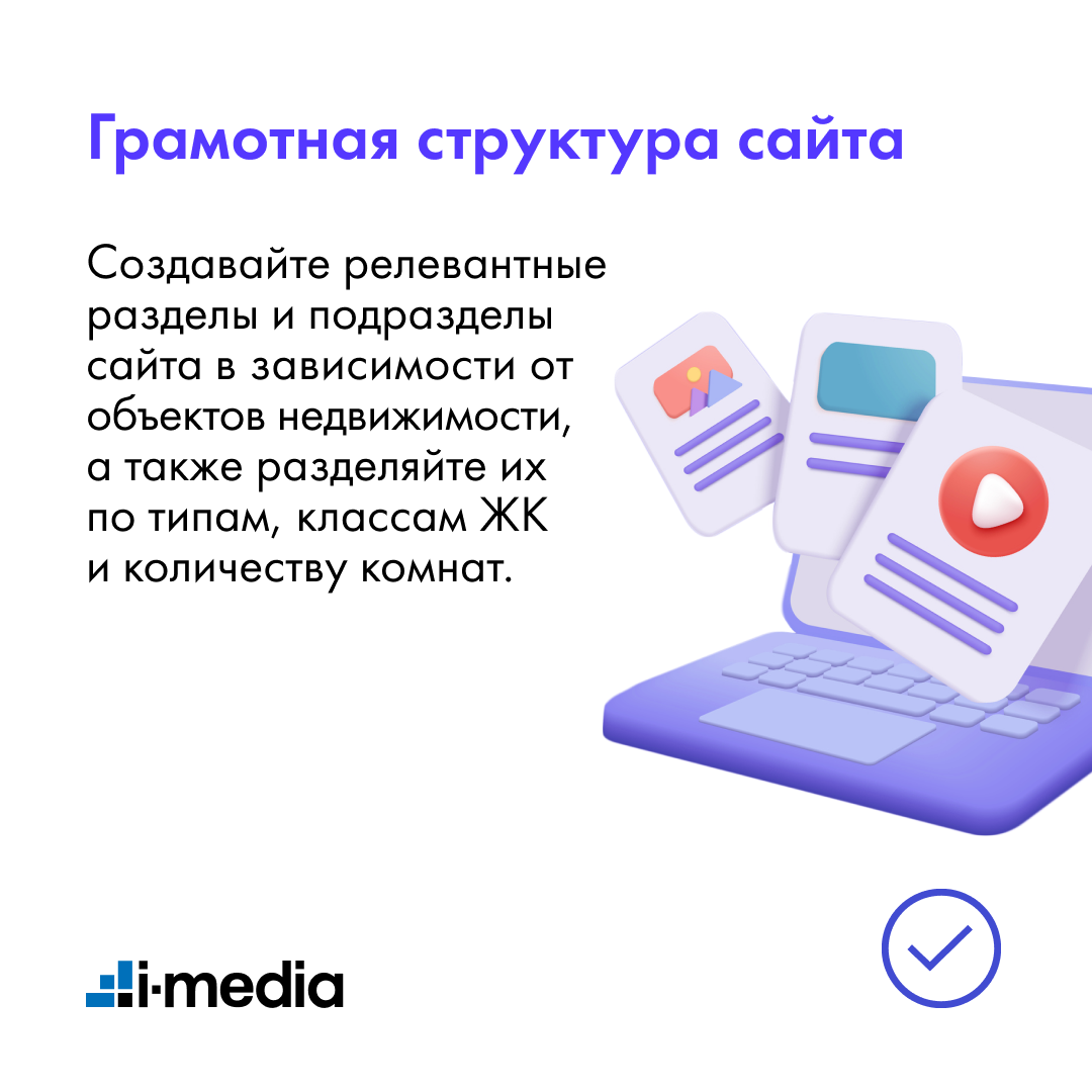 Создавайте релевантные разделы и подразделы сайта в зависимости от объектов недвижимости, а также разделяйте их по типам, классам ЖК и количеству комнат.