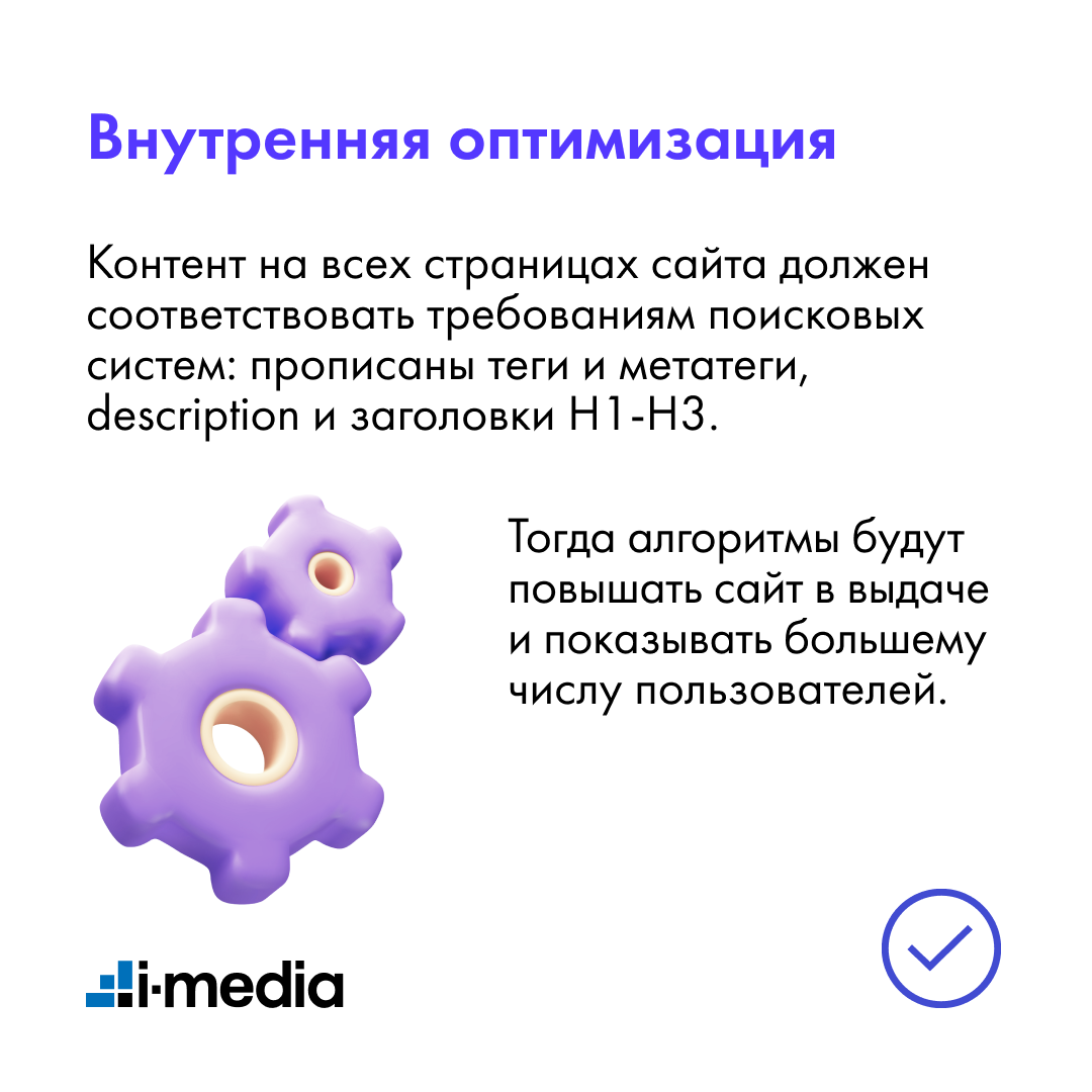Контент на всех страницах сайта должен соответствовать требованиям поисковых систем: прописаны теги и метатеги, description и заголовки H1-H3. Тогда алгоритмы будут повышать сайт в выдаче и показывать большему числу пользователей.