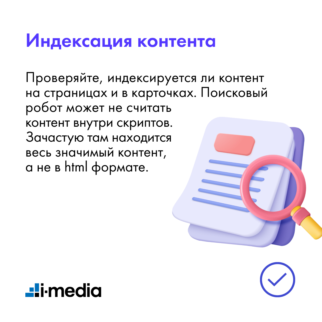 Проверяйте, индексируется ли контент на страницах и в карточках. Поисковый робот может не считать контент внутри скриптов. Зачастую там находится весь значимый контент, а не в html формате.