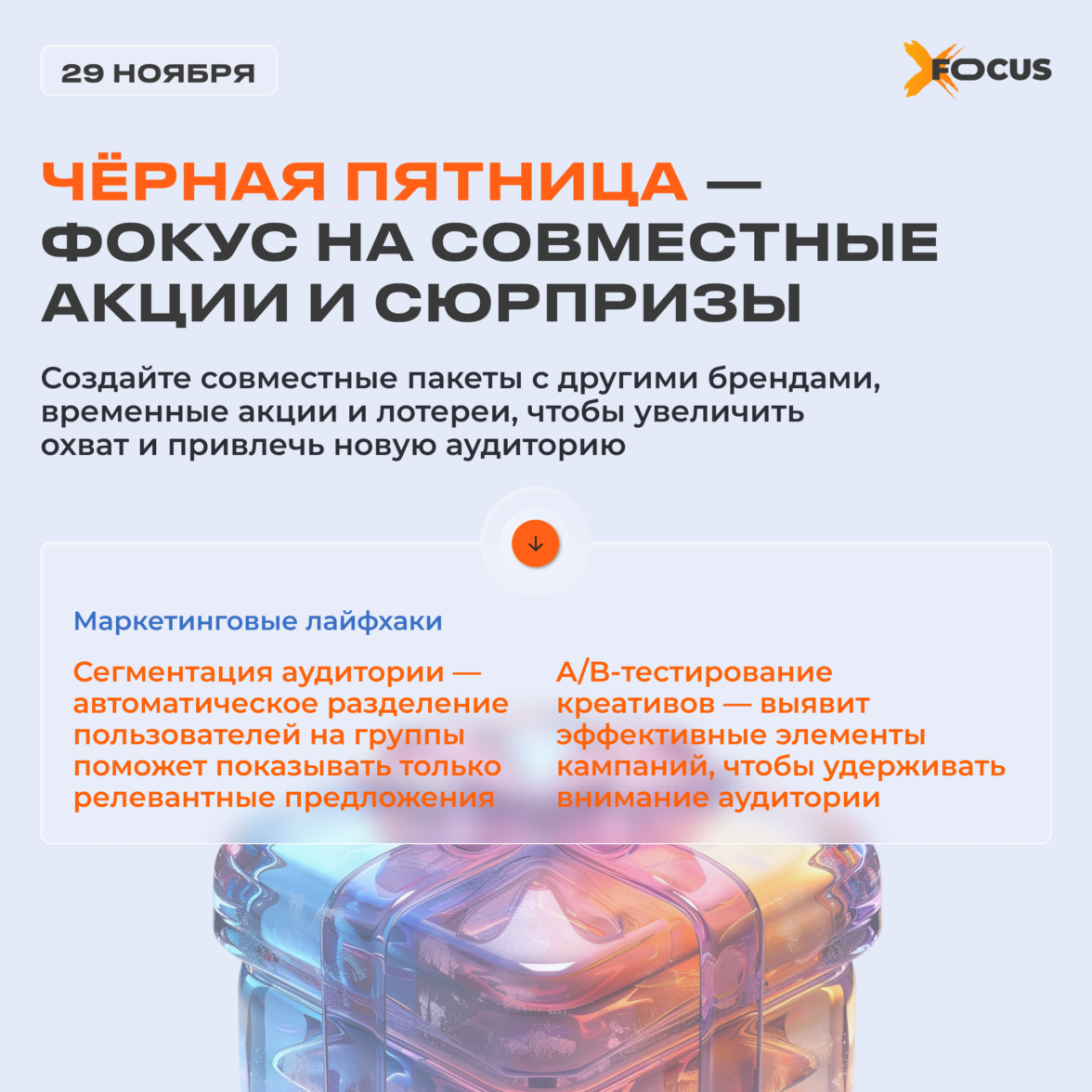 Черная пятница (29 ноября) — не только возможность снизить цены, но и шанс создать интересные совместные акции. Объединение усилий с другими брендами позволит вам охватить более широкую аудиторию и предложить уникальные товары.