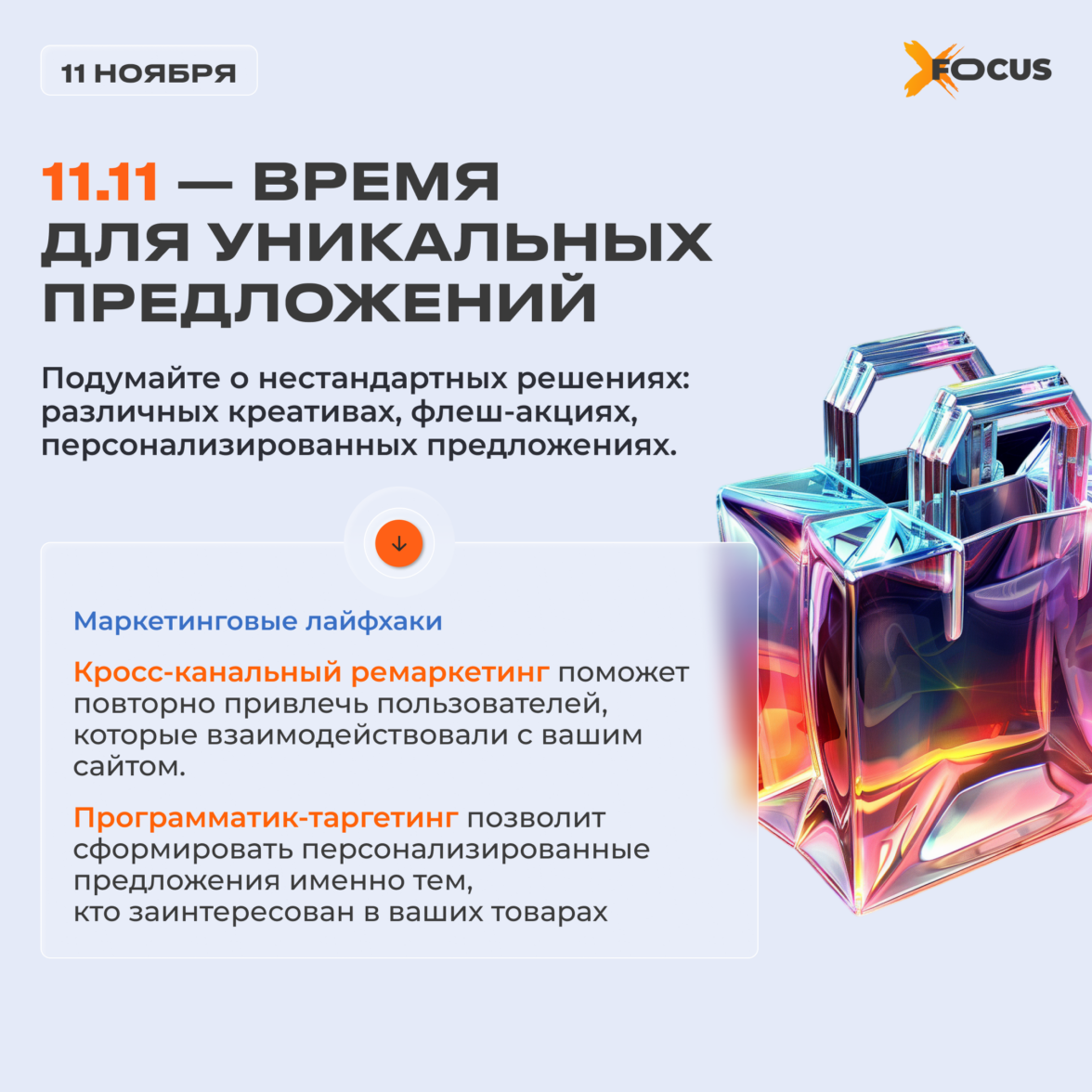 11 ноября открывает двери к огромным возможностям для привлечения покупателей. Чтобы выделиться на фоне конкурентов, помимо классической механики скидок, подумайте о нестандартных решениях: различных креативах, флеш-акциях, персонализированных предложениях.