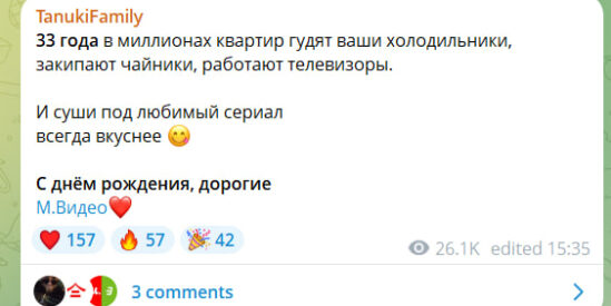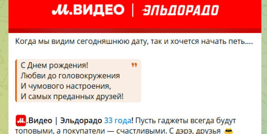 Поздравить М.Видео с 33-летием поспешили не только клиенты сети, но и партнеры. В соцсетях стартовал флешмоб, в рамках которого другие бренды присоединились к чествованию Компании и направили в ее адрес десятки добрых пожеланий, что подтверждает рыночный тренд к коллаборациям и реализации совместных инициатив.