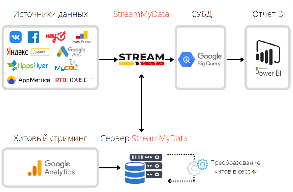 Сбор данных — выгрузка данных из систем аналитики, рекламных систем, внутренних CRM-систем и любых других источников, которые находятся в доступе клиента и хранят полезные данные (рис. 2). Осуществляется при помощи собственных коннекторов StreamMyData от агентства MediaNation. Данный этап подробно расписан в кейсе по сквозной аналитике для сервиса ЛитРес.