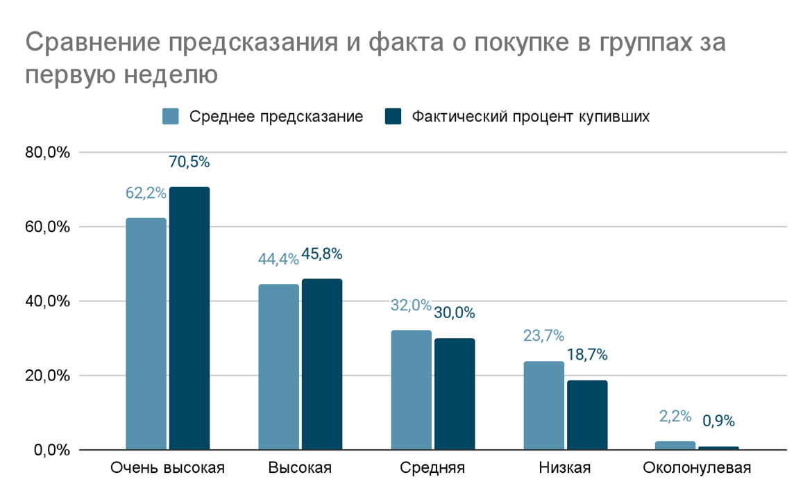 Диаграмма 1. Сравнение предсказания и факта о покупке в группах за первую неделю