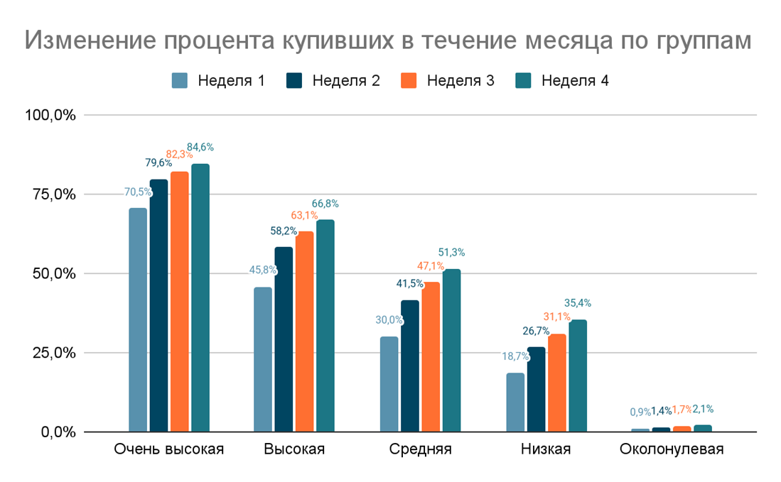 Обладая большим пространством для увеличения доли купивших, по итогу прошествия четырех недель, менее конверсионные группы (кроме «Околонулевая») приращивают процентные пункты сильнее, чем наиболее конверсионная группа.