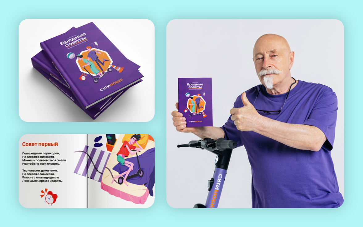 «Ситимобил» запустил коллаборацию с детским писателем Григорием Остером, который создал серию стихов-«вредных советов» для самокатчиков в шутливой форме. Например, большим компаниям, которые пытаются уместиться на одном самокате, был предложен стартап по пассажирским перевозкам.