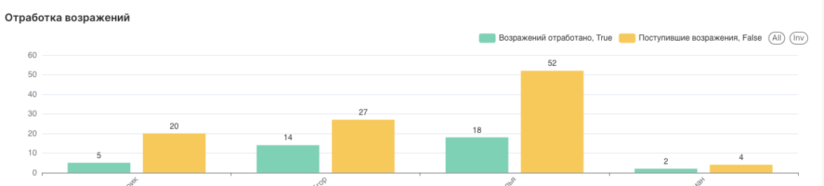 Например, если менеджер Виктор получил 27 возражений и отработал 14 из них, это будет отображено на диаграмме с соответствующими жёлтым и зелёным столбцами.