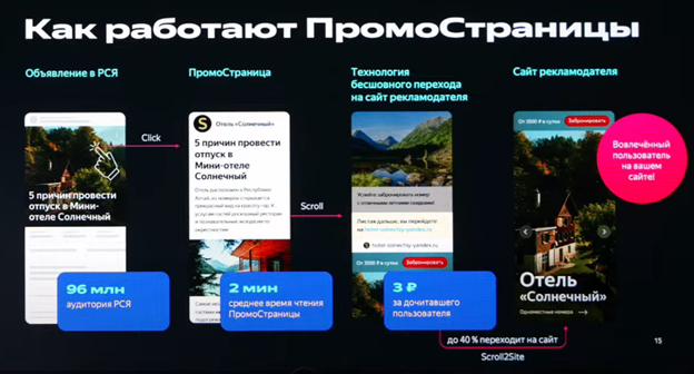 ПромоСтраницы оказались весьма востребованными у рекламодателей благодаря способности передать максимум информации о товарах или услугах через контент, что обычно оказывается затруднительным в обычной рекламе. Обычные баннеры не в состоянии охватить даже долю информации о 10 различных типах сепараторов зерна или проконсультировать пользователей по премиум-автомобилям.