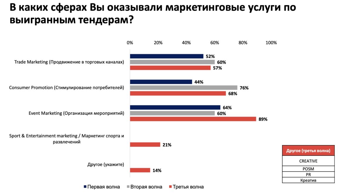 Ключевым сегментом услуг стал ивент-маркетинг — 89% респондентов в 2024 году в рамках выигранных тендеров занимались организацией мероприятий, в 2023 году эти услуги оказывали только 60% опрошенных. 68% участников исследования оказывали услуги в сфере стимулирования потребителей, 57% занимались продвижением в торговых каналах (трейд-маркетинг).