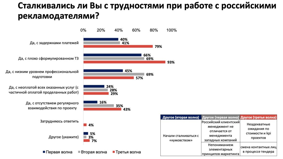 Основными проблемами с заказчиками-рекламодателями в 2024 году агентства назвали плохо сформулированное ТЗ (93% респондентов) и задержки платежей (79%). Причем год назад клиенты формулировали ТЗ четче и платили обязательнее: на аналогичные проблемы указали 69% и 41% респондентов соответственно.