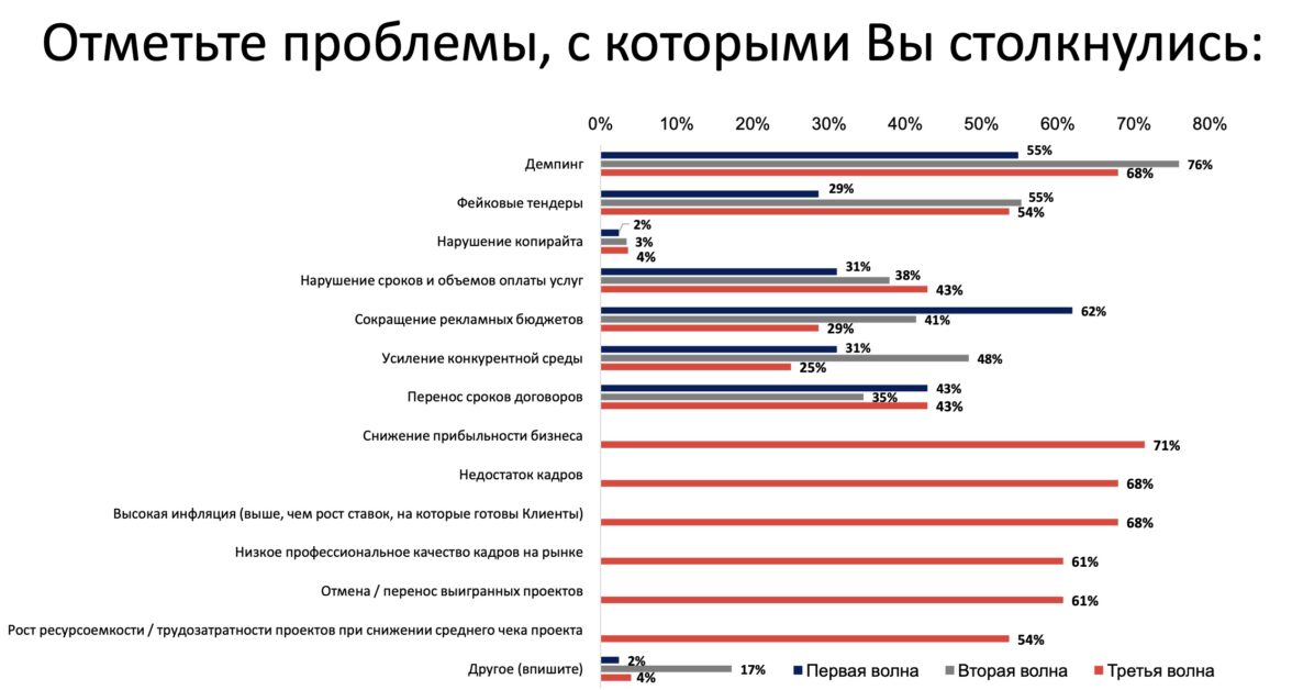 Несмотря на рост индустрии маркетинговых услуг в 2024 году, который во многом был следствием инфляции, и позитивным трендом появления новых рекламодателей, два кризиса последних пяти лет не прошли бесследно. Высокая конкуренция на рынке, демпинг, практика усложнения тендерных процедур без возмещения затрат, недобросовестные тендеры, постоплаты от рекламодателей, кадровый кризис на рынке — привели к тому, что бизнес модель агентств индустрии перестает работать. Падение прибыльности не дает агентствам инвестировать в развитие своих продуктов и в качественные кадры».
