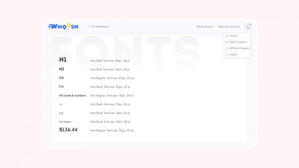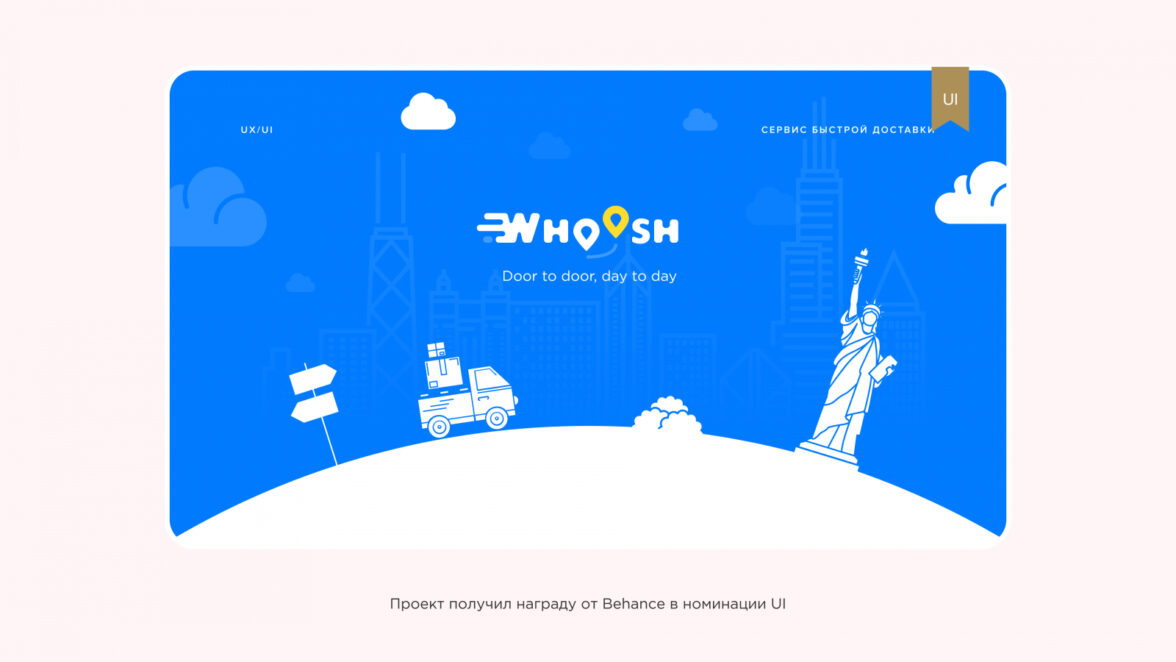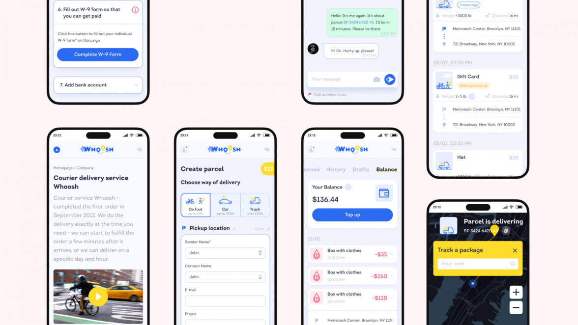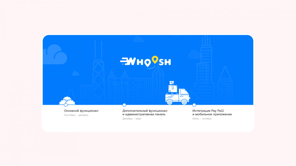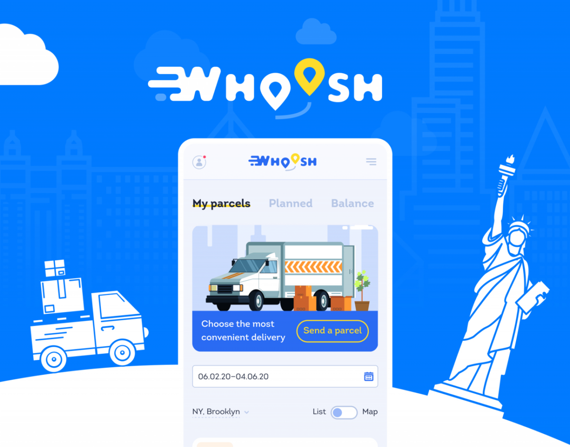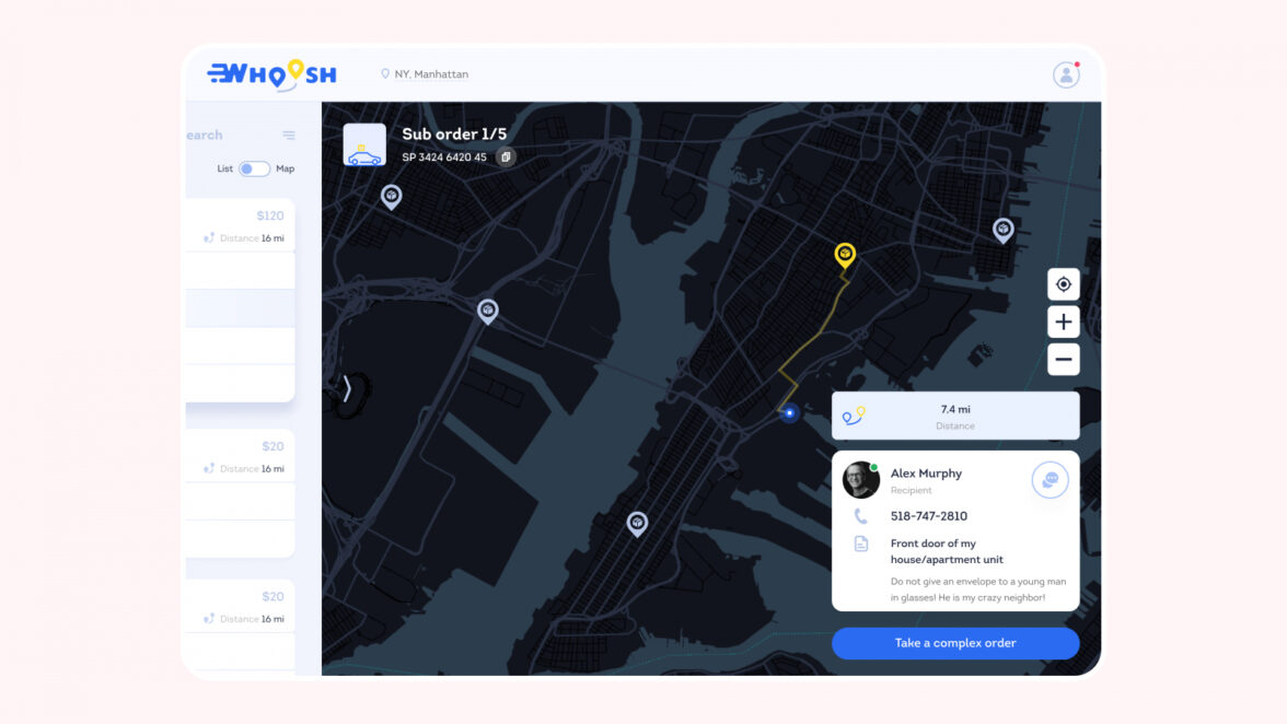 История проекта Whoosh началась в 2020 году. Заказчик обратился к нам для создания онлайн-сервиса экспресс-доставки по Нью-Йорку. Нужно было разработать удобный сайт, который станет надежным логистическим партнером для бизнеса и удобной площадкой для курьеров, ищущих работу.