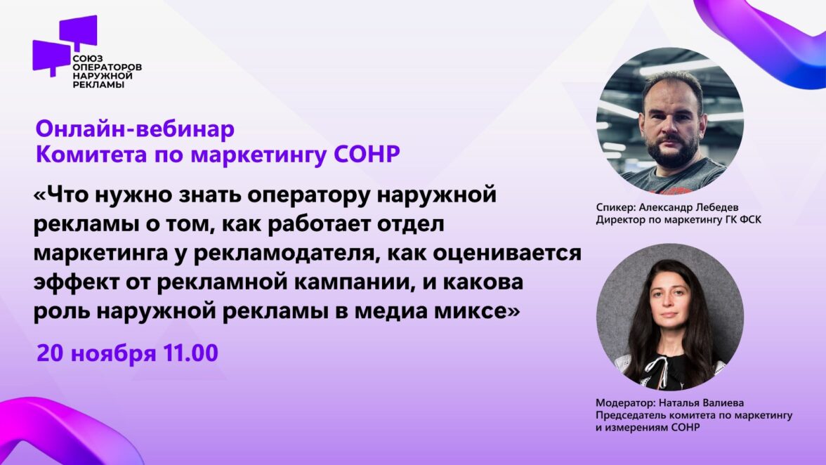 20 ноября в 11:00 приглашаем операторов наружной рекламы на онлайн-вебинар «Что нужно знать оператору наружной рекламы о том, как работает отдел маркетинга у рекламодателя, как оценивается эффект от рекламной кампании, и какова роль наружной рекламы в медиа-миксе».
