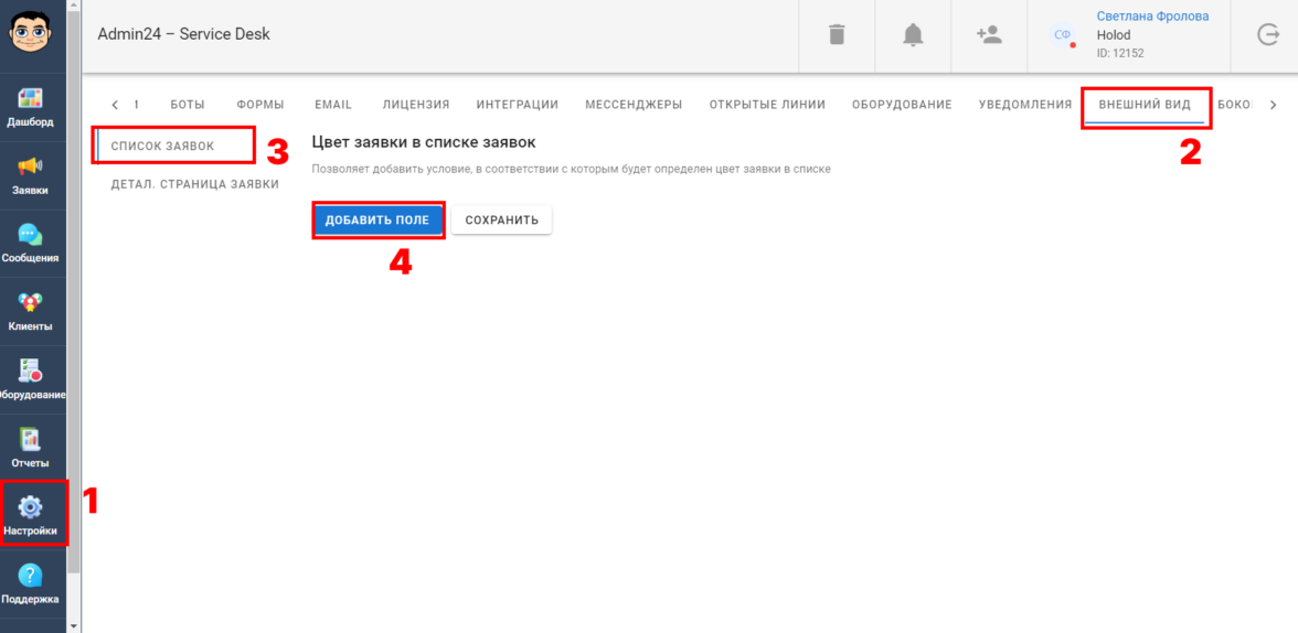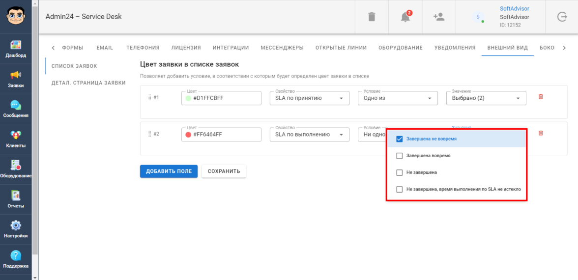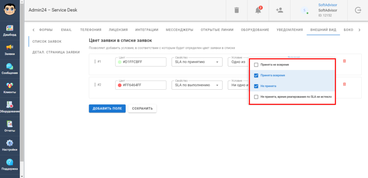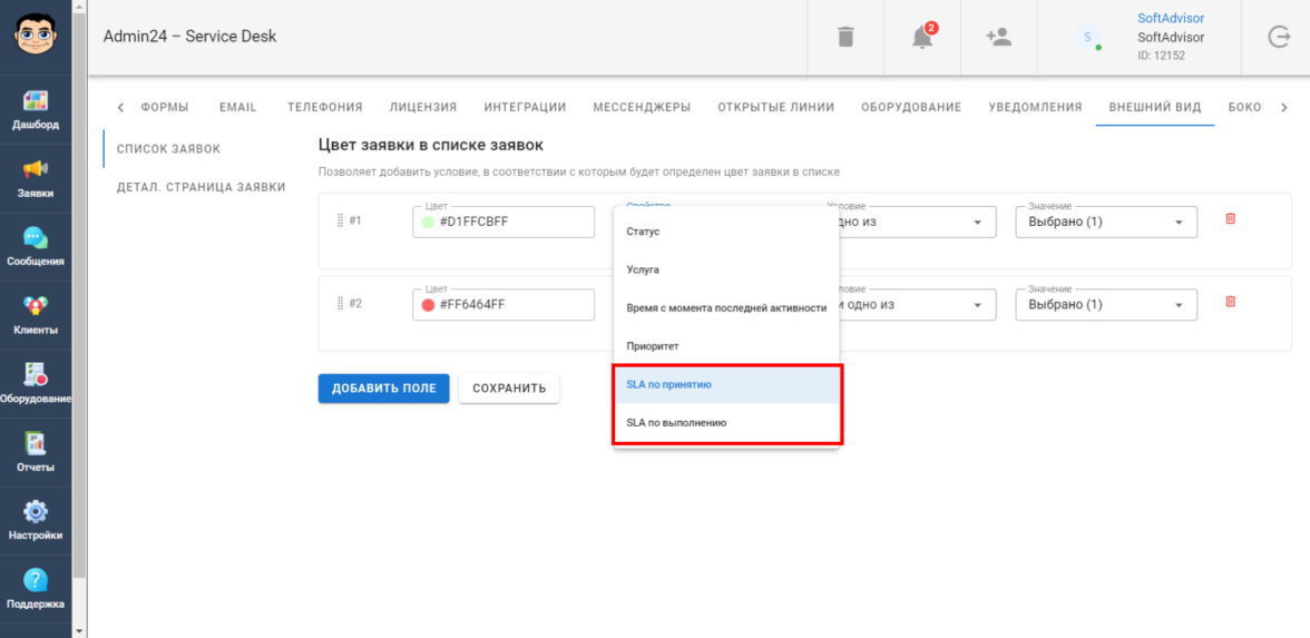 Теперь вы можете настраивать цвета заявок, в зависимости от SLA. Для этого перейдите во вкладку «Настройки» → «Внешний вид» → «Список заявок» и в пункте «Цвет заявки в списке заявок» нажмите «Добавить поле»: