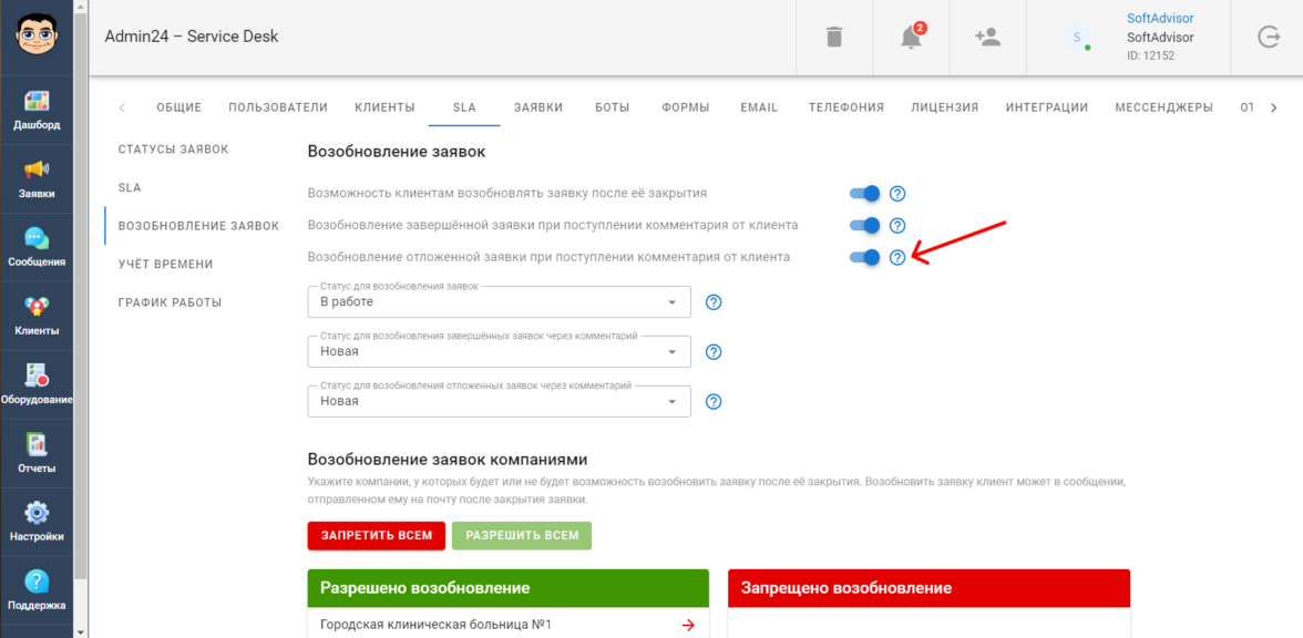 В разделе «Настройки» → «SLA» → «Возобновление заявок» появилась возможность возобновления отложенной заявки при поступлении комментария от клиента. Для этого нужно включить соответствующую функцию: