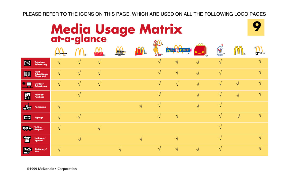 Брендбук Макдональдс. Детство, счастье, беззаботность, удовольствие — всё это до нас доносит брендбук американского фастфуда. Цвета, логотип и формы, связанные в наших головах с едой и семьёй делают McDonald’s легко узнаваемым и привлекательным для аудитории.