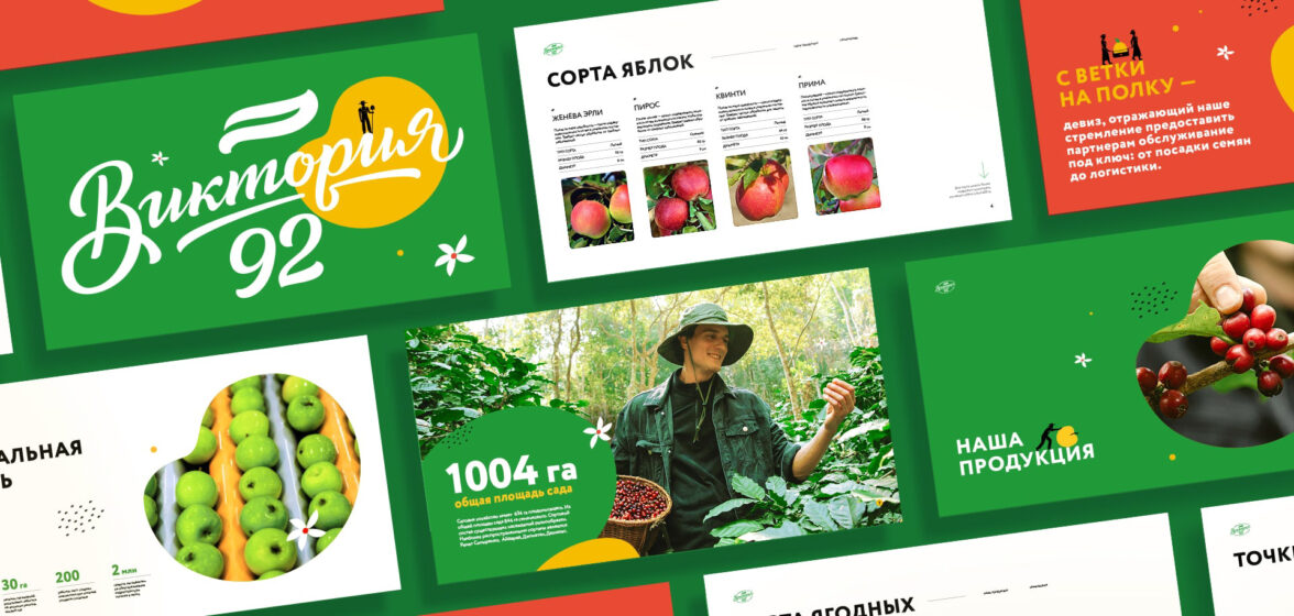 Основная идея брендбука — передать атмосферу свежести и единства процессов для достижения главной цели — поставки спелых фруктов на прилавки. Работники «Виктория-92» предстают перед нами жителями вселенной садоводства, которые живут по «законам спелости».