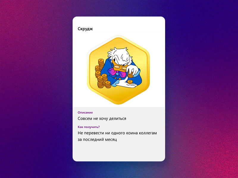 Как и в любой игре, без отрицательных ачивок не обошлось. Их не так много, но они подсвечивают важность участия в жизни агентства. Например, умение благодарить — это наша база. Если за месяц или даже за полгода ты не отправил ни одного коина-благодарности коллегам, получи и распишись, ачивка «Скрудж» твоя. Конечно, можно прибегнуть к «чистке кармы» в нашем коин-маркете и не портить свой виртуальный образ, но лучше не забывать выражать благодарность коллегам.