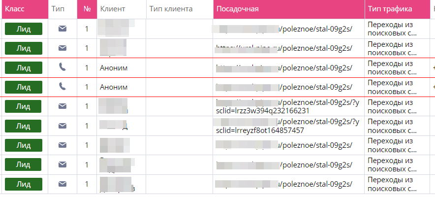 А вот так выглядят заявки со страниц блога из сервиса callibri: