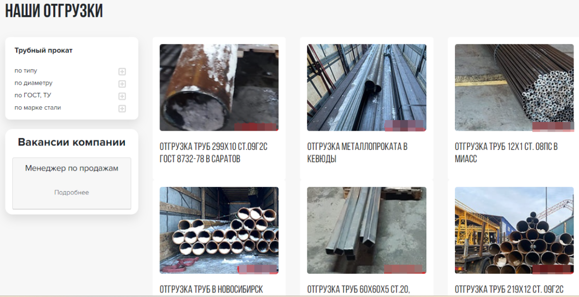 Страница отгрузок — это такой отчёт об отгруженной продукции с фото и описанием (позиция, вес, город). Страница положительно влияет на доверие посетителей сайта к компании, поскольку наглядно видна работа производителя.