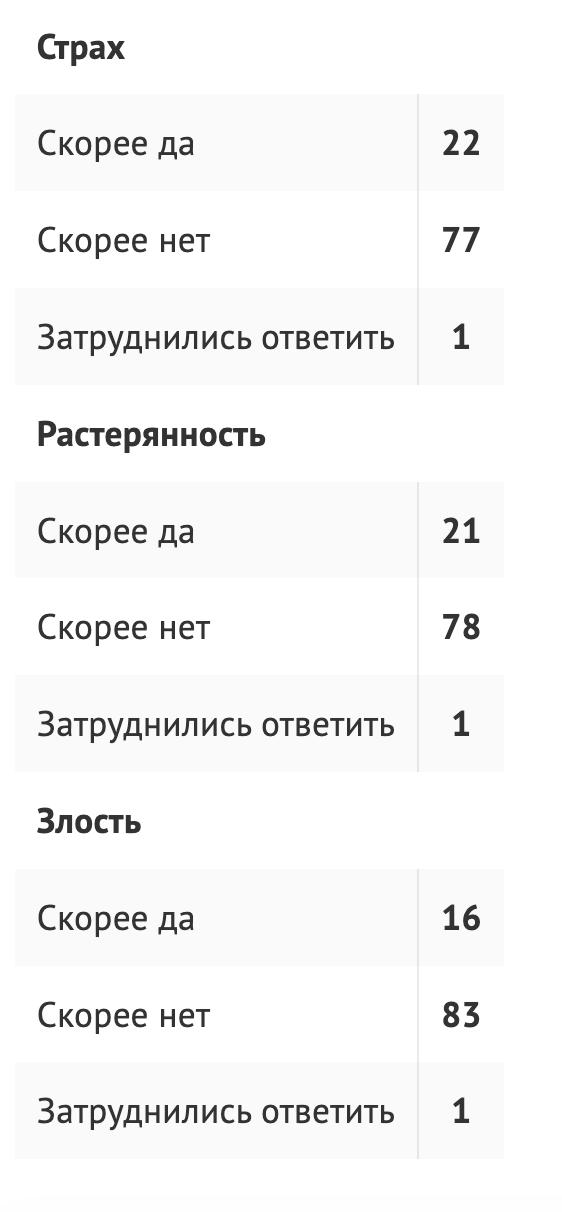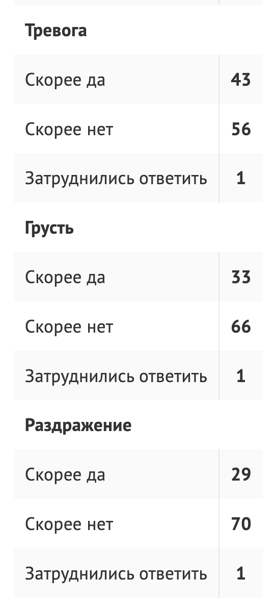 Перейдем к негативным эмоциям. Ни одну из шести не испытывало большинство россиян. Самой распространенной оказалась тревога. Тревожились четверо из десяти (43%). Грустил каждый третий (33%). Раздражение чувствовали трое из десяти (29%). Страх и растерянность – каждый пятый (22% и 21% соответственно). Злость – каждый шестой (16%).