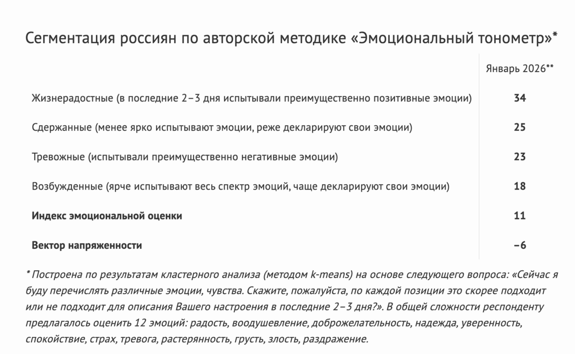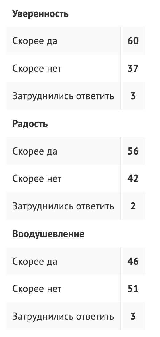 Подводя итоги, авторы исследования оценили эмоциональное состояние россиян положительно. Несмотря на сложные обстоятельства, в российском обществе созидательные эмоции доминируют над деструктивными, считают они.