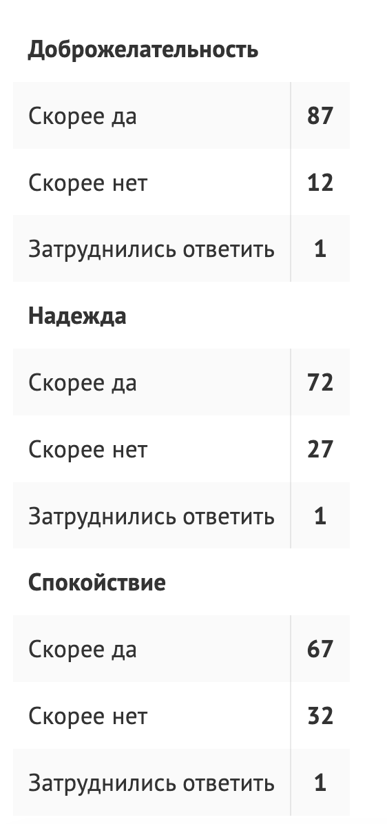 Итак, с 12 по 14 января подавляющее большинство, почти девять из десяти (87%) россиян были доброжелательными. Возможно, повлиял старый Новый год? Ощущение надежды испытывали трое из четверых (72%). Спокойными были две трети (62%). Уверенность в обществе была распространена примерно также, как спокойствие – 60%. Чуть больше половины (52%)  респондентов испытывали в течение двух-трех дней радость. Чуть меньше половины (46%) – воодушевление.