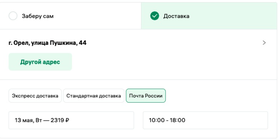 Клиент видит реальные варианты доставки, сколько стоит доставка Почтой и когда придёт посылка — даже если живёт в отдалённом посёлке