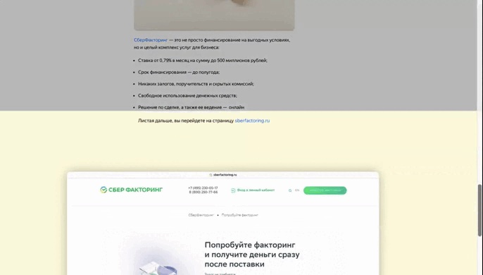 Дочитав статью пользователь автоматически попадает на сайт рекламодателя (эта функция работает при помощи технологии Scroll2Site).