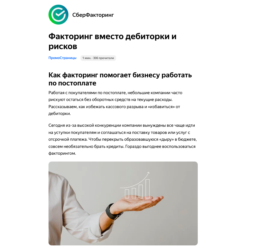 Объем входящих лидов вырос в 10 раз. За 3 месяца показа статей со средним процентом дочитывания 85% нам удалось охватить 476 тыс. пользователей. На данный момент мы показываем 4 статьи в ПромоCтраницах и планируем увеличить их количество.