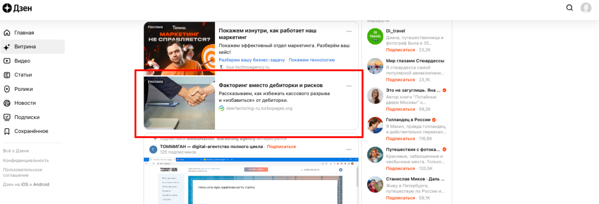 Еще одним преимуществом является схожесть оформления статей ПромоСтраниц со статьями Дзена (до апреля 2022 — «Яндекс.Дзен»), из-за этого публикации в ПромоСтраницах, на первый взгляд, не выглядят рекламно.