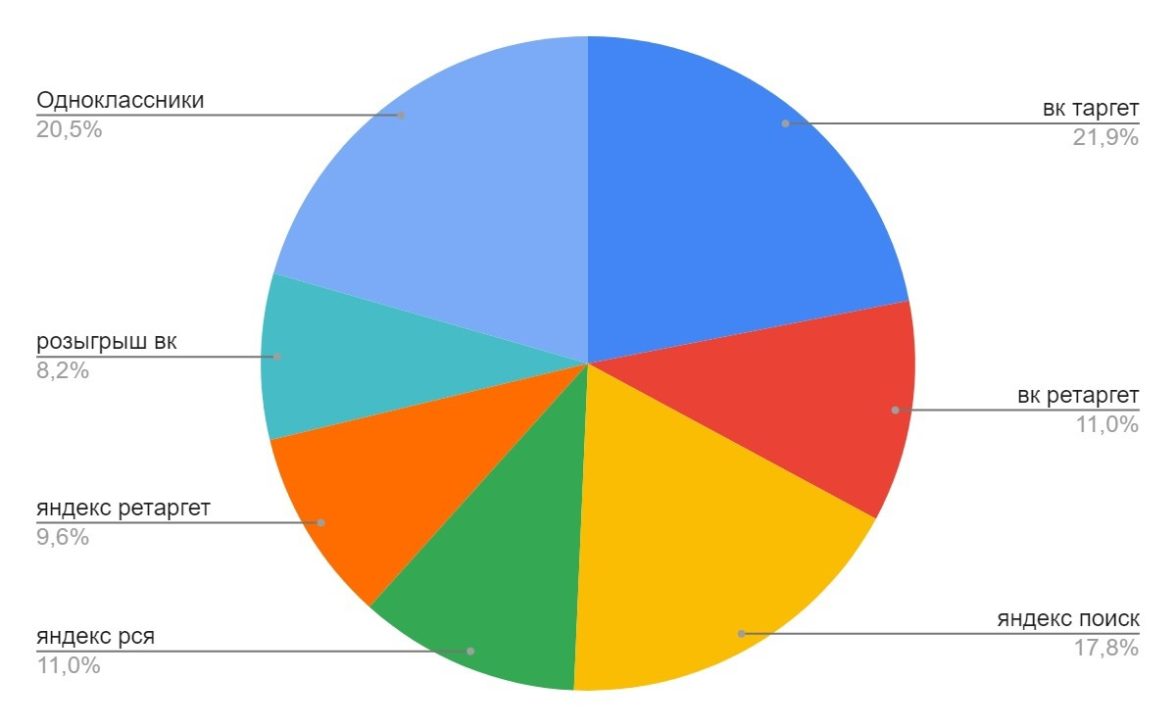 Старт рекламной кампании — июль. Распределение бюджетов по каналам: