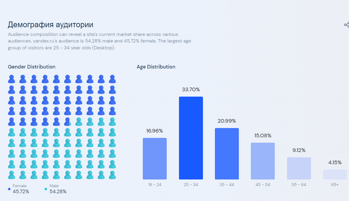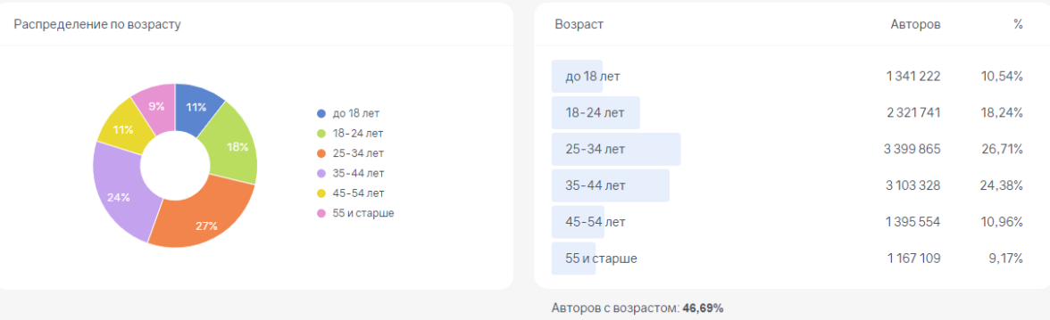 Очень важный момент — это конкретное количество нашей аудитории по площадкам, где можно настраивать рекламу в России. Давайте посмотрим распределение пользователей по возрастам: