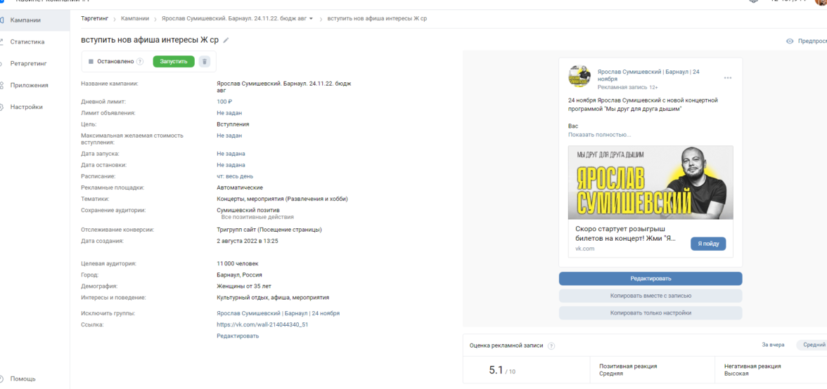 Протестировали ретаргет предыдущих концертов в Барнауле, чтобы протестировать, каких еще артистов можно отнести к похожим.