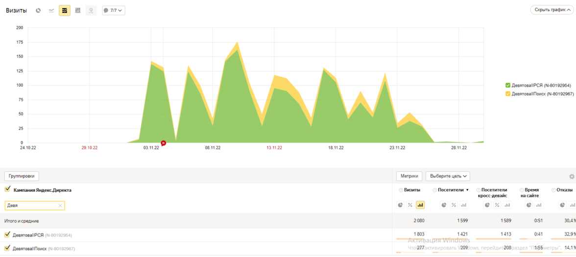 В этом кейсе мы действительно ориентировались на эффект омниканальности. Девятова — это артист, на которого собирают в основном наружной рекламой. И бюджет на наружку был приличный. Как только начался подъем запросов, мы подхватили его в Яндексе хорошими ставками. Так же в РСЯ мы использовали все возможные форматы в РСЯ — фото, афиши, проморолики. Таким образом мы расширили возможности присутствия в РСЯ.