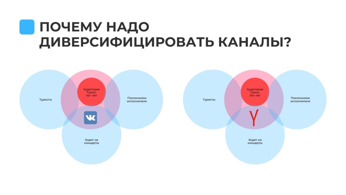 Поэтому при медиапланировании необходимо максимально диверсифицировать каналы. Это позволяет достать наш маленький сегмент аудитории в максимальном количестве площадок и таким образом увеличить покрытие рекламой.