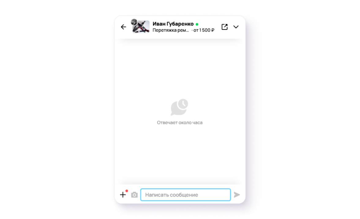 После нажатия на кнопку «Написать» появляется диалоговое окно, в котором отображается среднее время ответа продавца на основе анализа данных от Авито