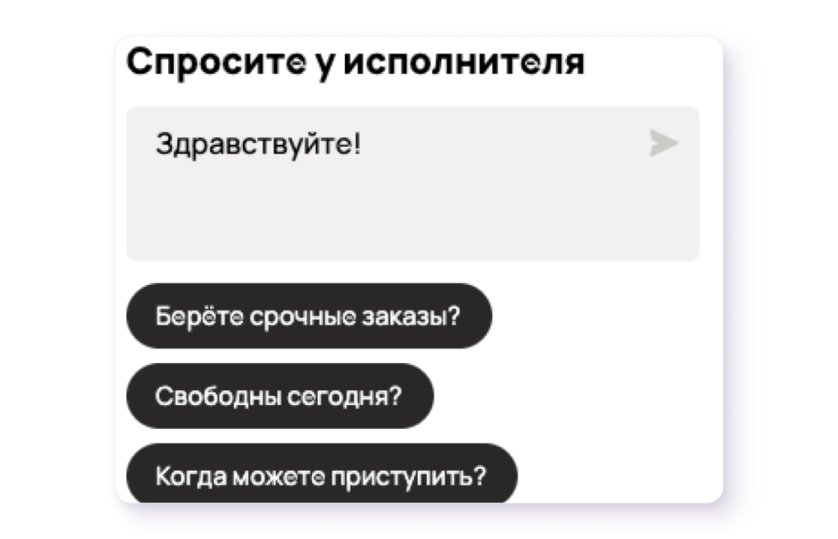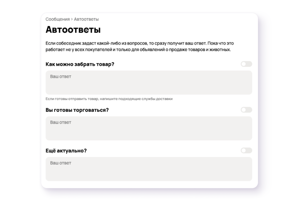 Сообщения на Авито хороши еще и тем, что продавец может настроить кнопки с шаблонами вопросов для клиента. Если человек нажмет на одну из них, то текст кнопки автоматически появится в сообщении. Можно будет отправить его так или дописать.