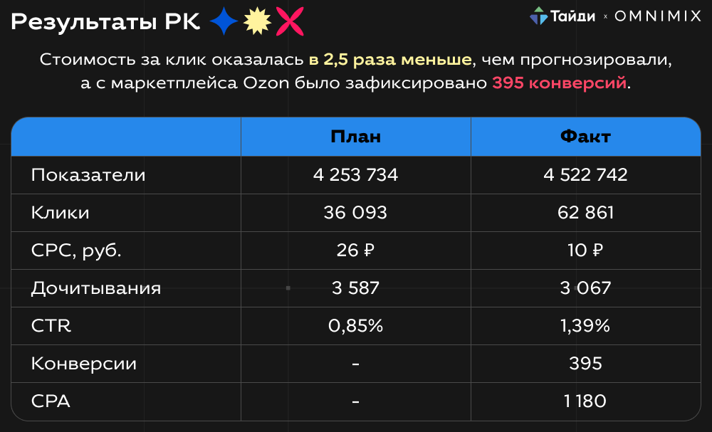 Стоимость за клик оказалась в 2,5 раза меньше, чем прогнозировали, а с маркетплейса Ozon зафиксировано 395 конверсий.