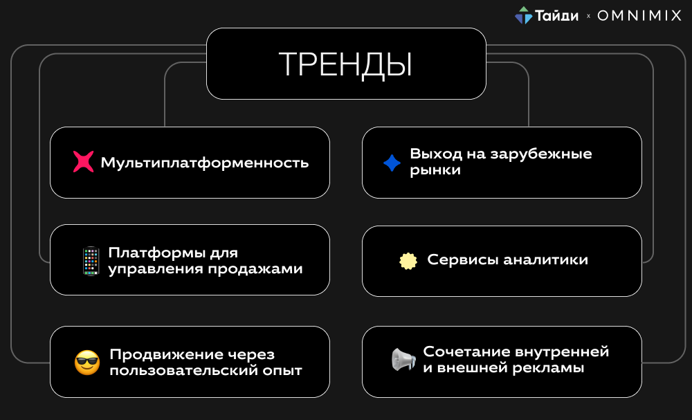 В прошлом году укрепился тренд на мультиплатформенность, т.е. размещение товаров сразу на нескольких площадках. Подобное множественное присутствие позволяет малому и среднему бизнесу быстрее выходить на больший доход: с выходом на второй маркетплейс доход увеличивается в 2 раза, а с выходом на третий может стать больше в 5 раз.