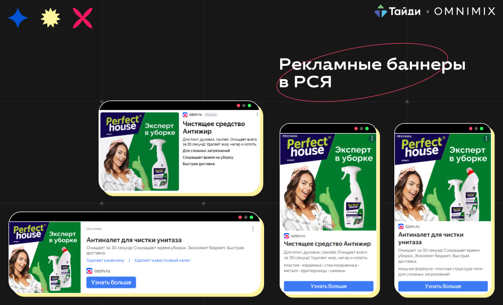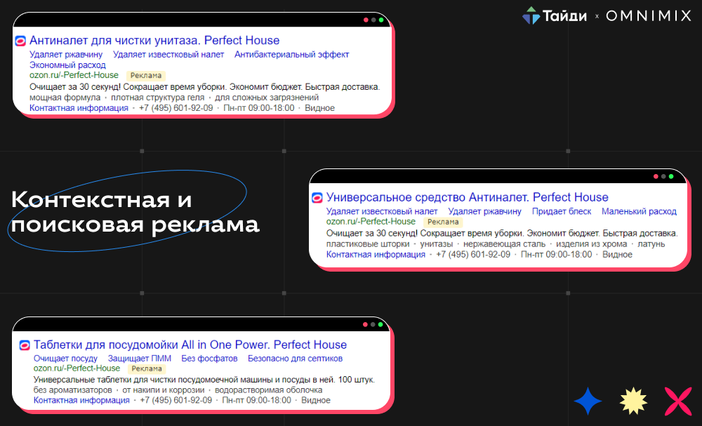 Главное преимущество поисковой рекламы — высокая степень контекстуальности и релевантности. На поиске и в РСЯ можно точно настроить таргетинг на необходимую ЦА. Пользователи видят рекламу, которая соответствует их запросу, что повышает вероятность перехода на маркетплейс с целью дальнейшей покупки. Рекламные баннеры в РСЯ адаптивны, что позволяет охватить большое количество рекламных площадок.