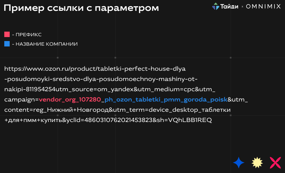 префикс — это обязательный «маячок» по которому Ozon понимает, что пользователь пришел на маркетплейс именно с внешней рекламы. Префикс имеет вид «vendor_org_000000» и уникален для каждого продавца. Префикс указан в личном кабинете селлера в разделе «Продвижение»;