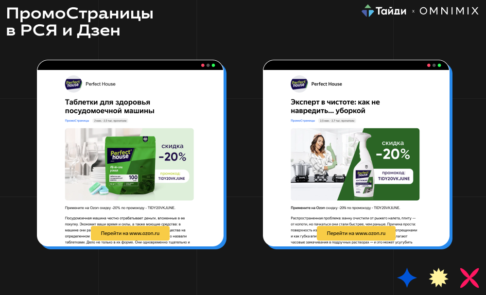 3. На ПромоСтраницах в РСЯ и Дзен мы разместили 2 рекламные статьи, в которых продвигали таблетки для посудомоечной машины и средства «Антижир» и «Антиналет». Главное преимущество статей на ПромоСтраницах — возможность подробно рассказать о продукте, включая его характеристики, особенности, преимущества и способы использования. Алгоритмы ПромоСтраниц автоматически показывают статьи аудитории, которая заинтересована в приобретение бытовой химии. Далее система показывает публикации похожей аудитории: тем, что прочитал статью или перешел на сайт в процессе чтения.