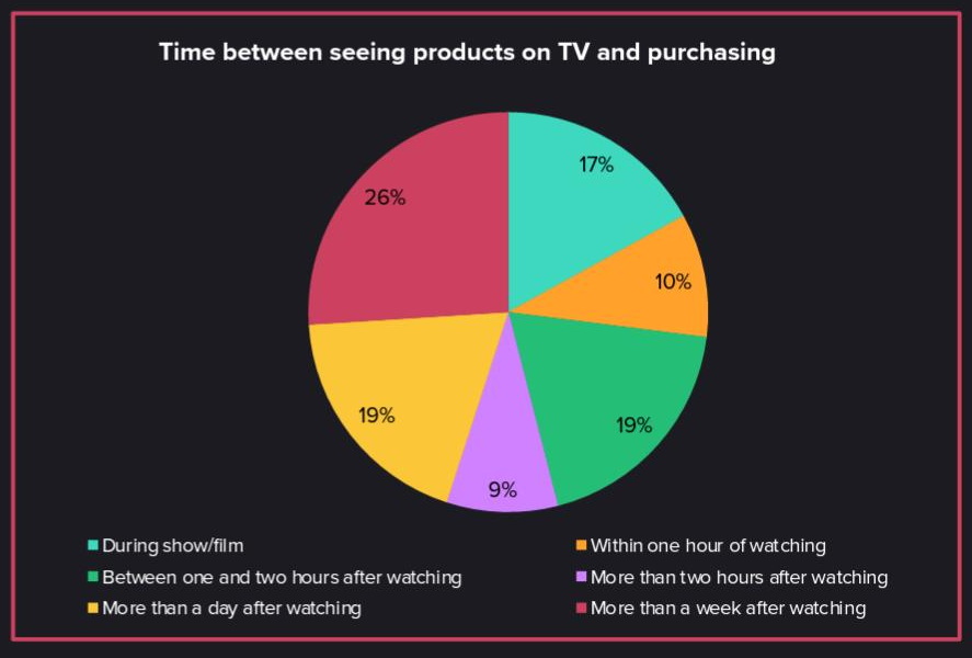 Среди опрошенных, 34% покупают товары из продактплейсмента. Из них по истечении двух недель после просмотра покупку делают 26%, в период от одного дня до двух недель — 19%, в течение двух часов после просмотра — 29%. Самые нетерпеливые (17%) совершают покупку еще до завершения просмотра.