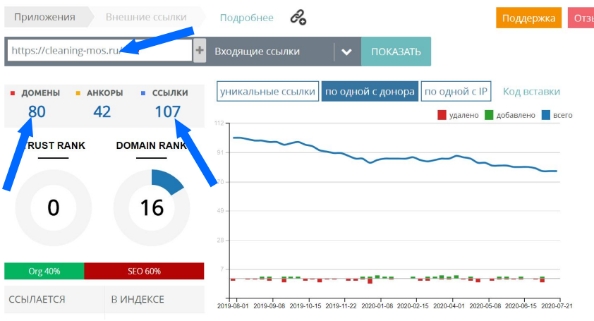 На примере сайта конкурирующей клининговой компании мы видим ссылочный профиль, на который можно ориентироваться при продвижении.