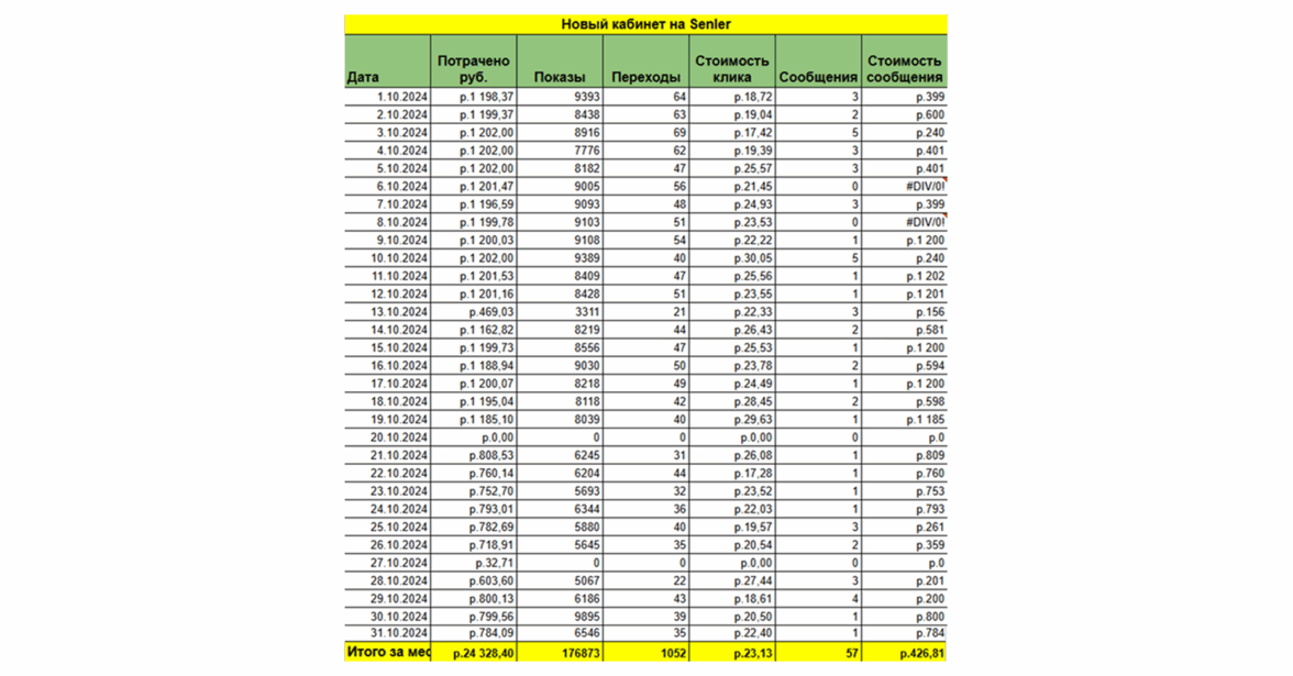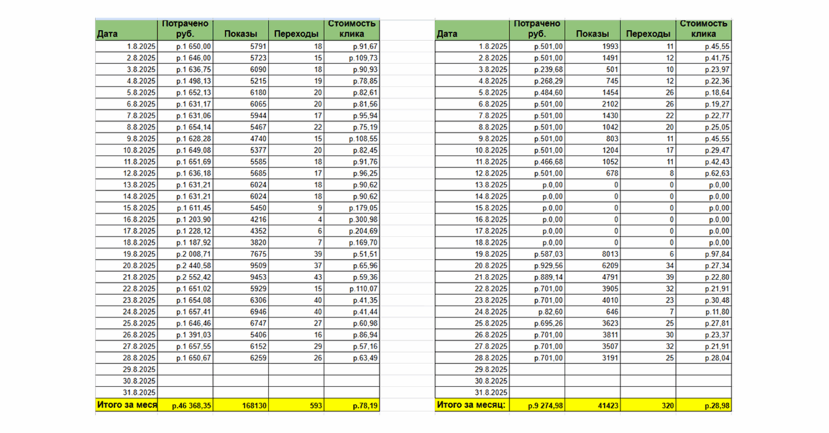 Мы вели проект через ежедневные отчёты по кабинетам и направлениям: отдельно фиксировали расходы, показы, переходы, стоимость клика и итоговые действия (обращения или подписки).Это позволило сравнивать эффективность разных целей на одном языке и принимать решения не «по ощущениям», а по цифрам. В результате предприниматель видит, сколько стоит лид и сколько стоит подписчик, и может планировать бюджет под задачи недели или сезона.