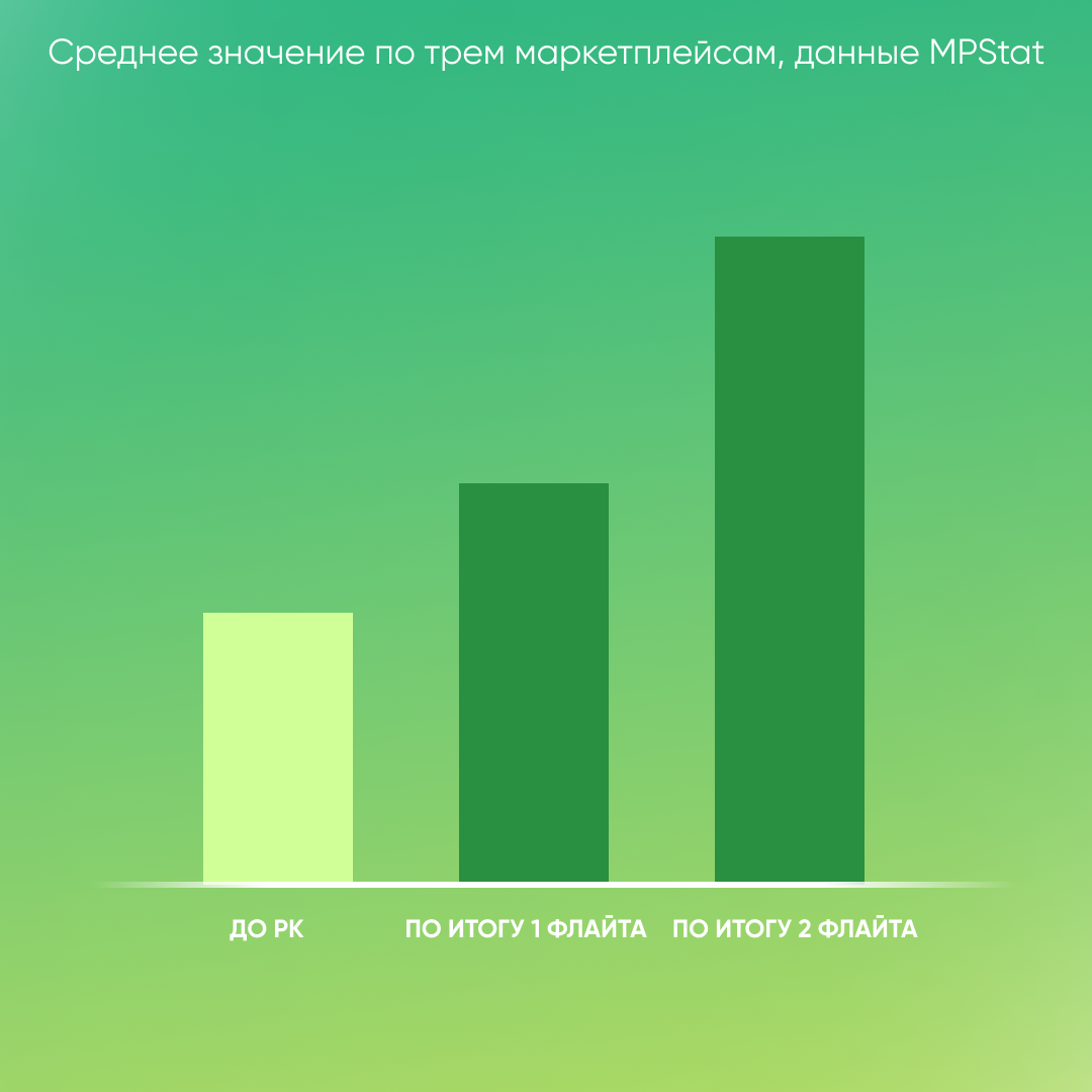 Увеличение количества отзывов: среднее количество отзывов на карточках товаров увеличилось в 7 раз к концу второго флайта. Больше отзывов — больше доверия, и это напрямую влияет на продажи. Мы создали среду, где клиенты охотно делятся своим опытом и рекомендациями.
