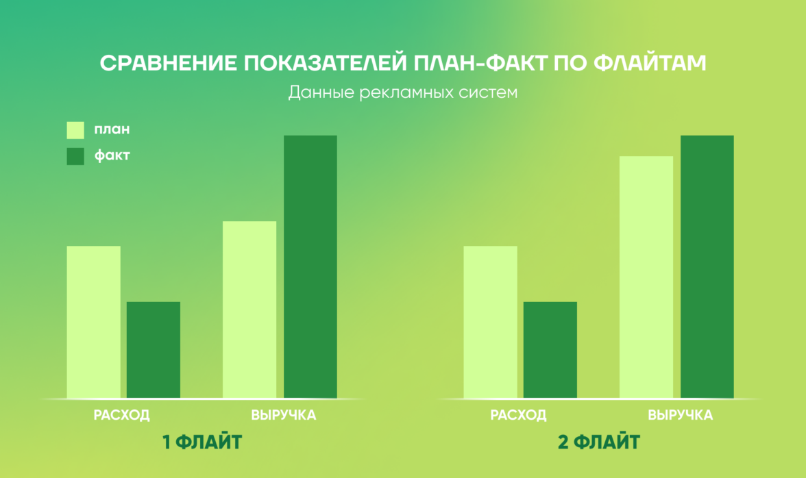 В рамках запланированного бюджета удалось добиться перевыполнения KPI по выручке: +59% в первом флайте и +1% во втором. Это не просто цифры, это доказательство нашей эффективности. При планировании второго флайта получилось дать более реалистичный прогноз благодаря накопленной статистике.