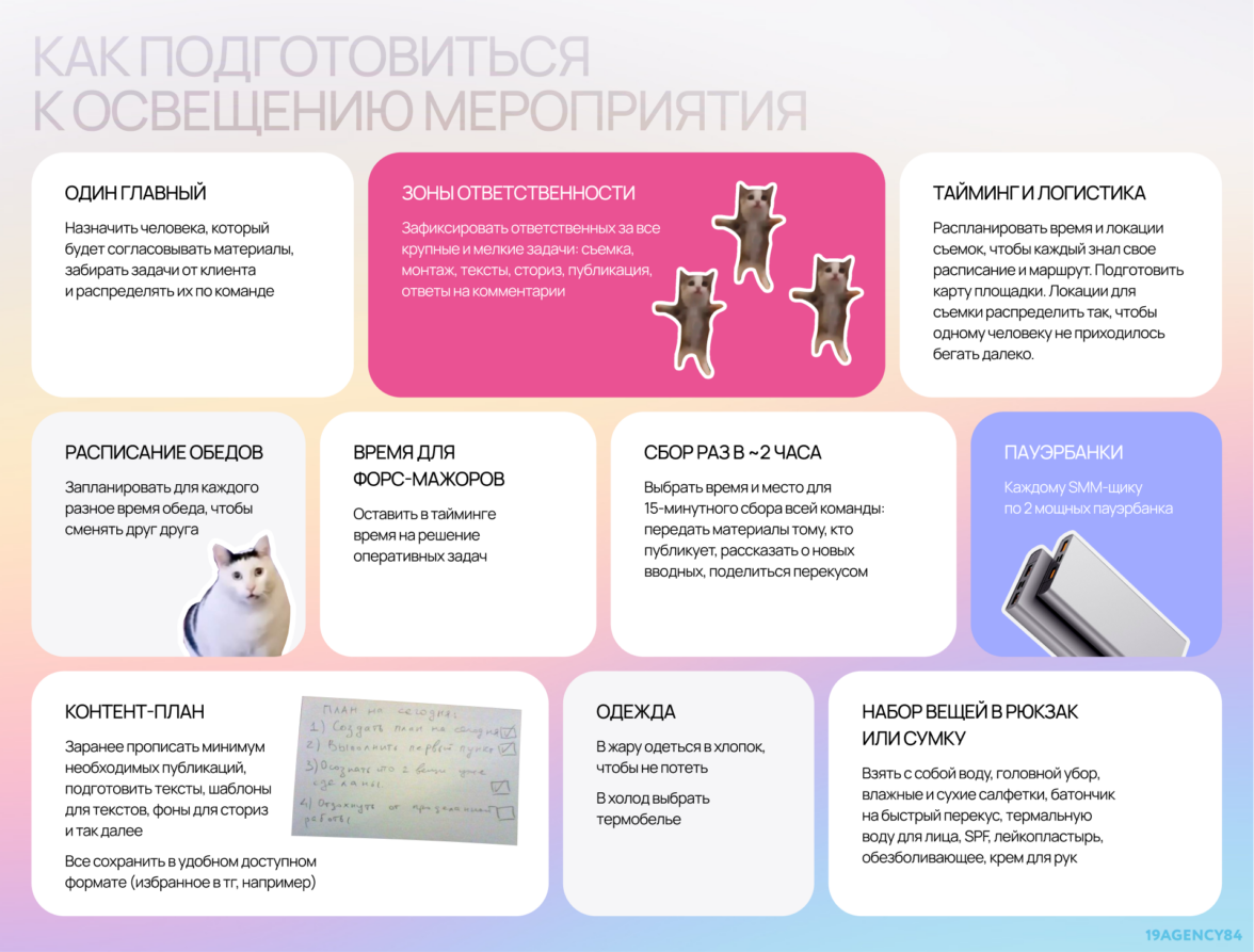 Если вы не только продвигаете мероприятие заранее, но и транслируете его в соцсетях в момент проведения, нужна основательная подготовка. Задача руководителя, проджекта или тимлида — организовать процессы так, чтобы все знали свои задачи и чувствовали себя комфортно. Даже если что-то пойдет не так, что часто бывает на ивентах.